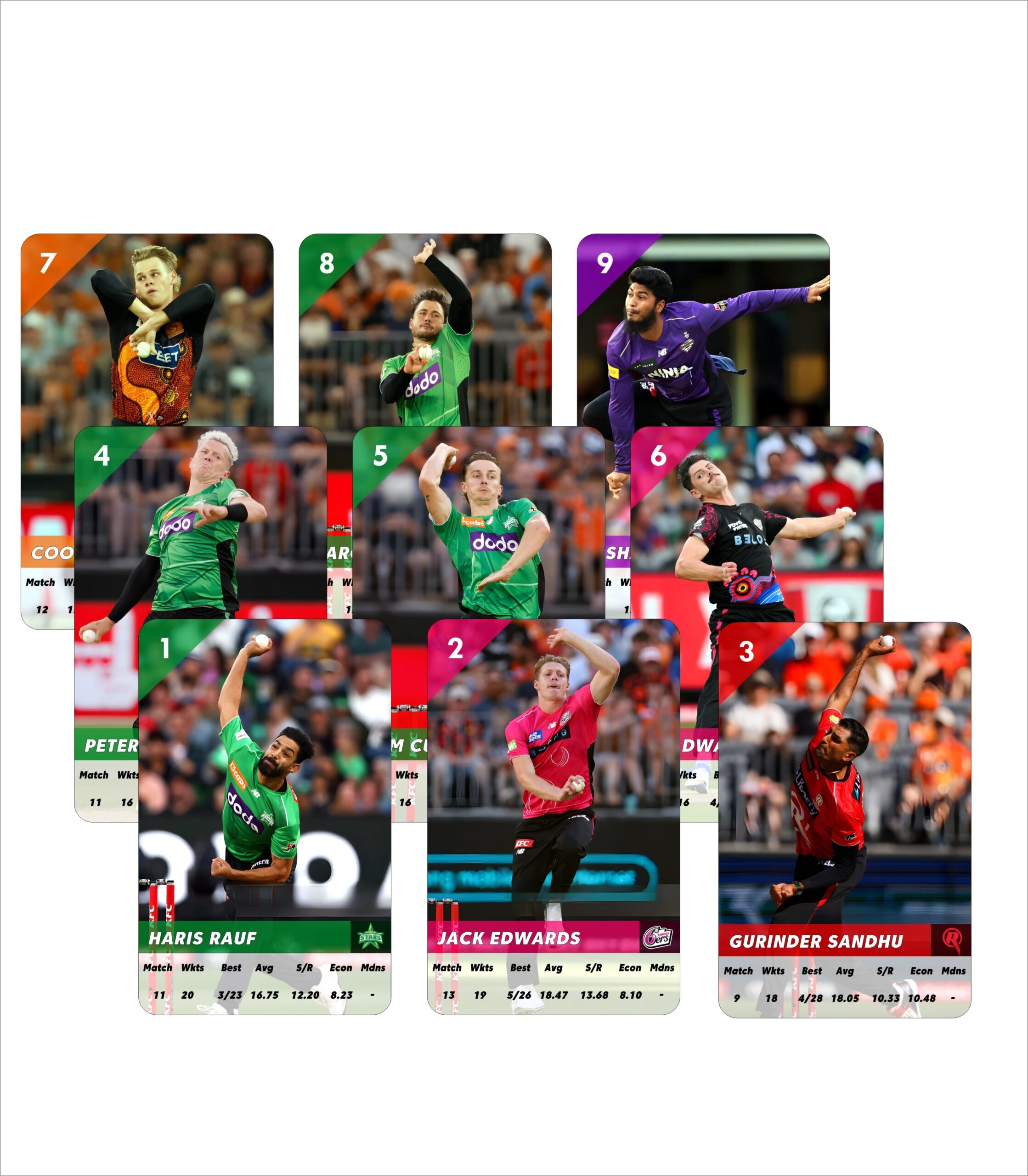 On the bowling front, the top 25 cards include the season’s most effective wicket-takers and game-shapers. Haris Rauf led the pack with the highest haul of wickets, supported by strike bowlers like Peter Siddle, Ben Dwarshuis, Tom Curran, and Rishad Hossain, each combining attacking skill with restrictive bowling at key moments. These cards provide quick stats — such as wickets, averages, and economy rates — celebrating the players who consistently delivered breakthroughs throughout BBL|15.
