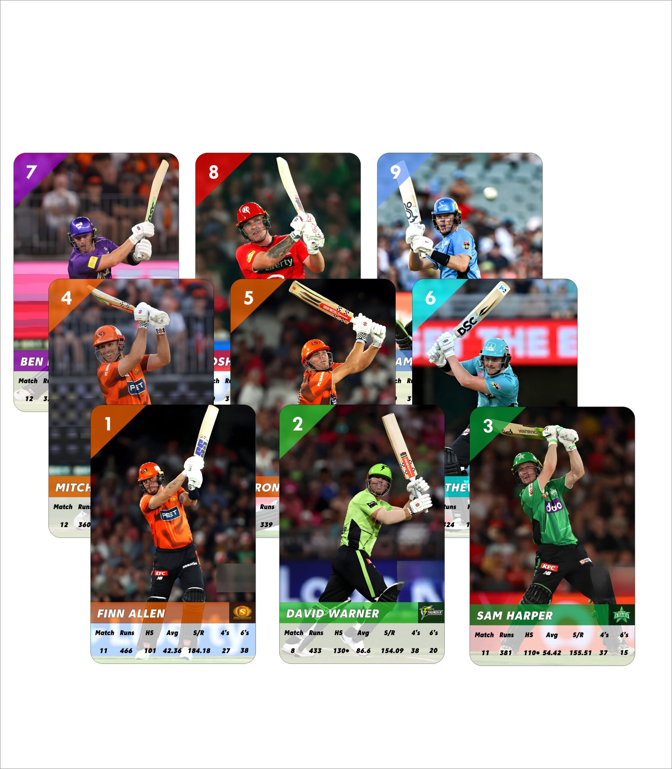 The BBL|15 Top 25 Batsman & Bowlers Cards showcase the standout performers from the 2025–26 Big Bash League season. These cards highlight the best batting and bowling talents based on runs scored and wickets taken throughout the tournament. Leading the batting charts were explosive run-getters like Finn Allen and David Warner, who topped the season with over 430 runs each, combining big totals, high strike rates, and impactful innings that shaped their teams’ fortunes. Behind them, dynamic batters such as Sam Harper, Aaron Hardie, and Matt Renshaw also featured prominently with consistent contributions.