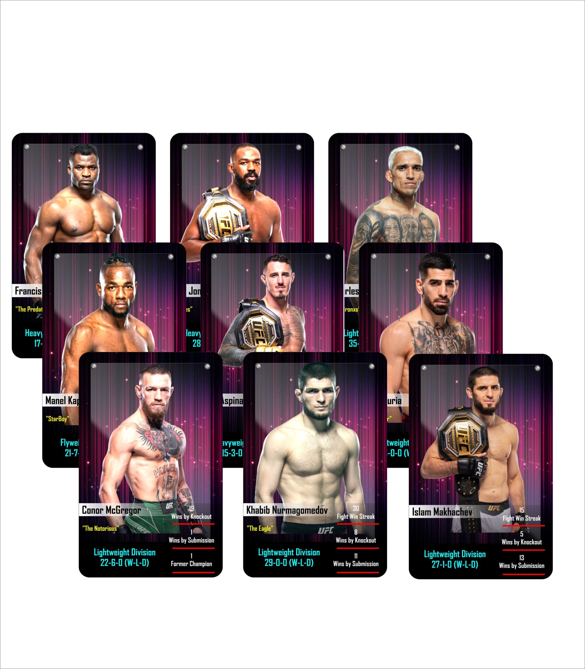 From legendary fighters to modern-day champions, our UFC card sets bring the energy of the Ultimate Fighting Championship right to your hands. Whether you’re a collector, gamer, or UFC enthusiast, these trump cards are designed to entertain, engage, and excite.