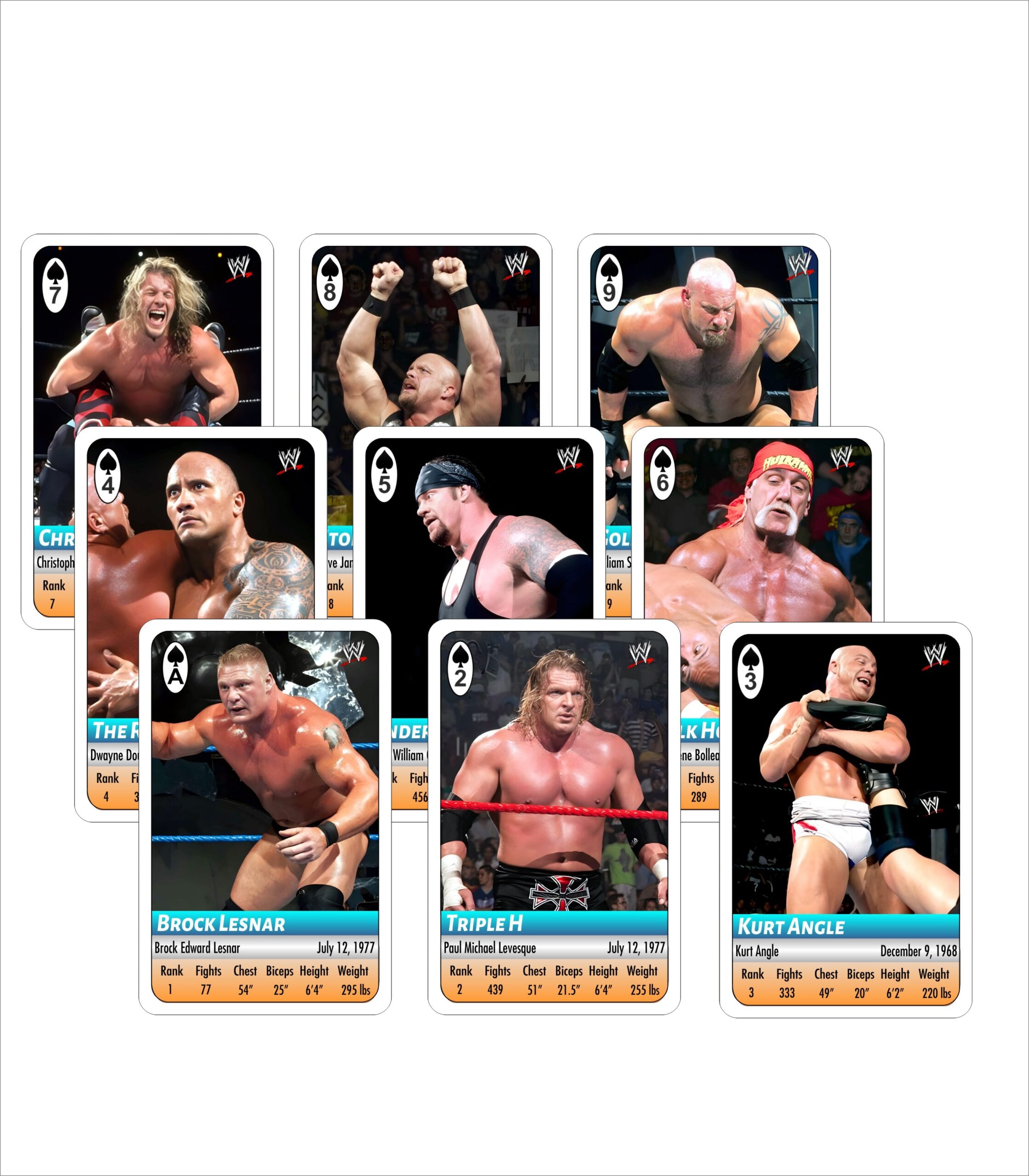 Each card highlights a legendary wrestler along with ratings for Strength, Skill, Stamina, Charisma, and Finisher Power—perfect for fun battles, trading, or adding to your WWE collection. Crafted using premium card stock, these trump cards are built for durability and hours of gameplay.